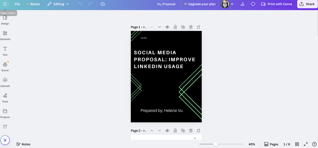 As I went through reviewing my sources, this occurred to me: why not create a proposal as well? I just love seeing information into place—it makes sense to me and makes me stay on task about what I’m doing. So, I proceeded directly to Canva. I love it because the templates make it so easy to organize things nicely and get creative. If I’d tried building the proposal in Slides or Google Docs, I’d have ended up with a cluttered mess that I’d struggle to make sense of when I went back to it a week later.
