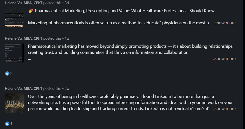 This project prompted me to remember that LinkedIn can be a pharma marketing game-changer if used appropriately. So much more than career announcements and corporate news, the platform can be an inspiration, support professional growth, and develop enduring relationships in the health realm.