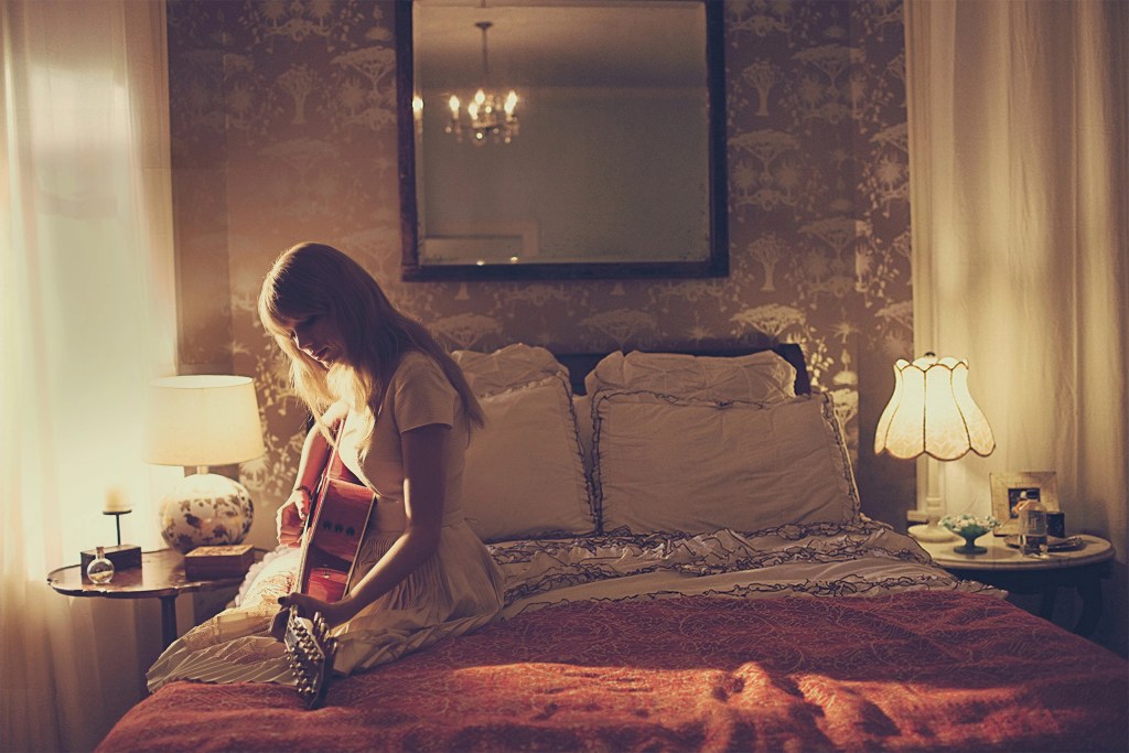 Taylor sits alone in her bedroom strumming along to her guitar. She is likely trying to create an original song based on her life experiences such as past romance. Sitting in a dim lighted room helps her focus on setting the mood and tone of her music. By being alone, she can focus on thinking of ideas to write her lyrics while creating a melody on her guitar.