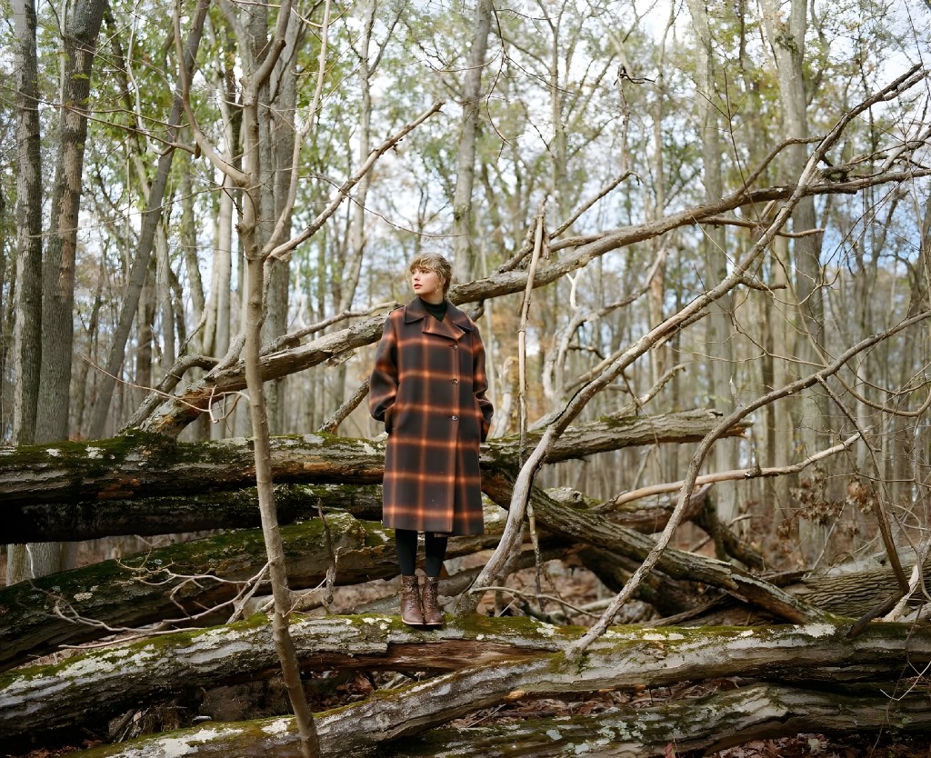Taylor stands in the forest looking out to her right. She is looking for inspiration for her music to write and produce based on her observation. Instead of being in a room or city, she chose to visit the forest to find originality for the theme of her upcoming music. This helps her plan out her future in her music career to maintain her reputation within the entertainment industry.