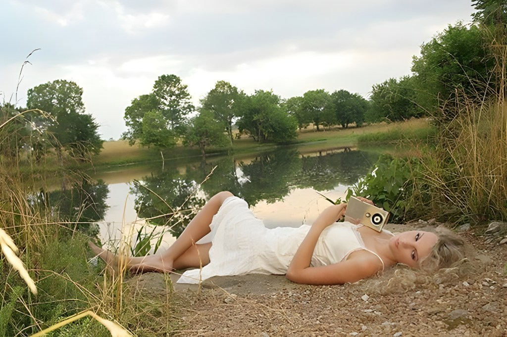 Here we see Taylor laying on the field near a lake looking to her left while holding what looks like a camera. She is likely visiting the area to take pictures for her memories or collect ideas for her new songs by recording them to bring home to look through them. She likes to rest on the field to enjoy nature and reminiscence the good times growing up before she embarked on her music journey. Being a country girl, she did not mind laying on the ground barefoot to embrace nature for its habitat.