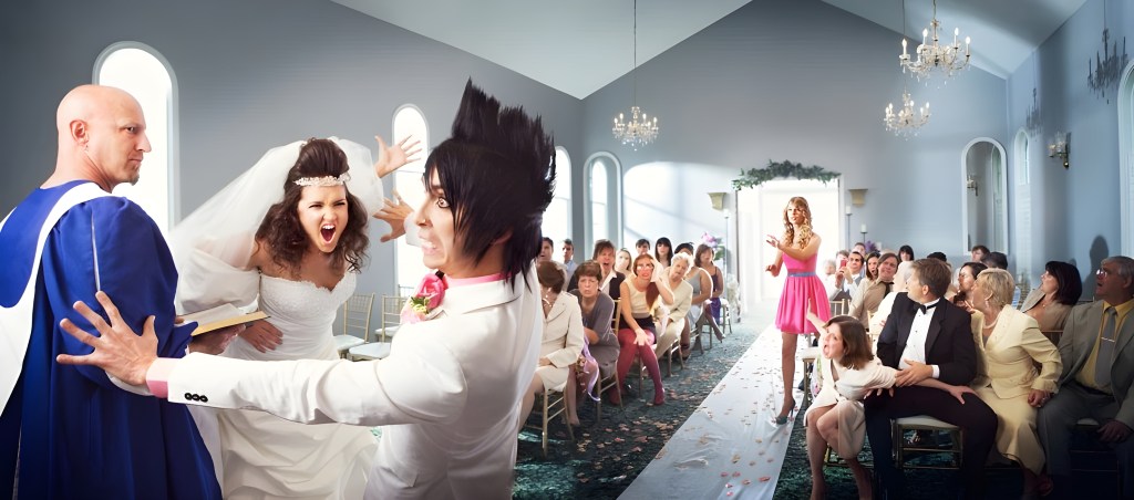 Taylor attends an wedding, most likely her old friend’s who invited her. However, the wedding did not go well as we see a bride arguing with her groom due to disagreements. There is such an uproar in the bride, resulting in Taylor standing up to try to stop the fight from escalating. Meanwhile, the officiant stares at the groom in confusion, likely because the groom overstepped his line that sparked an outrage in the bride.