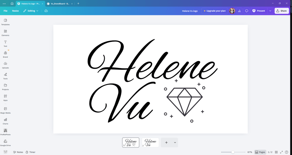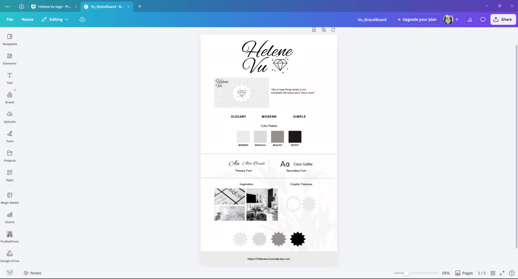 Branding for me began with the creation of a logo. I created multiple versions of my logo using both Canva and Photoshop to try to create a logo that represented myself and my brand. I was able to create many rough drafts using Canva. Once I had a clear idea of my logo vision, I began using Photoshop to create more polished versions (especially the diamond since I want it to be black like my name). I went through multiple iterations before I was able to develop a logo that reflected my image but was not overly complex. I wanted my logo to be clean, modern, and flexible to use for any type of work within my portfolio.