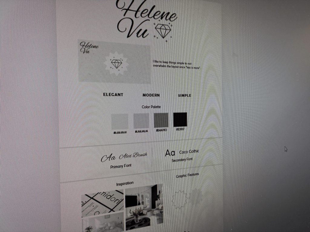 After finalizing my logo, I made the transition to establishing my brand board. This encompassed my vision for every aspect of my overall brand identity and gave me direction when I would begin designing my portfolio. The inspiration for my brand board was pulled directly through my own personality, style of design, and artistic preferences. I tend to gravitate toward simple, clean, and minimal designs that have great user experience, and I wanted this to be the basis of my brand. Instead of cluttering the viewers’ experience with unnecessary elements, I chose to create something with a very intentional and cohesive look.